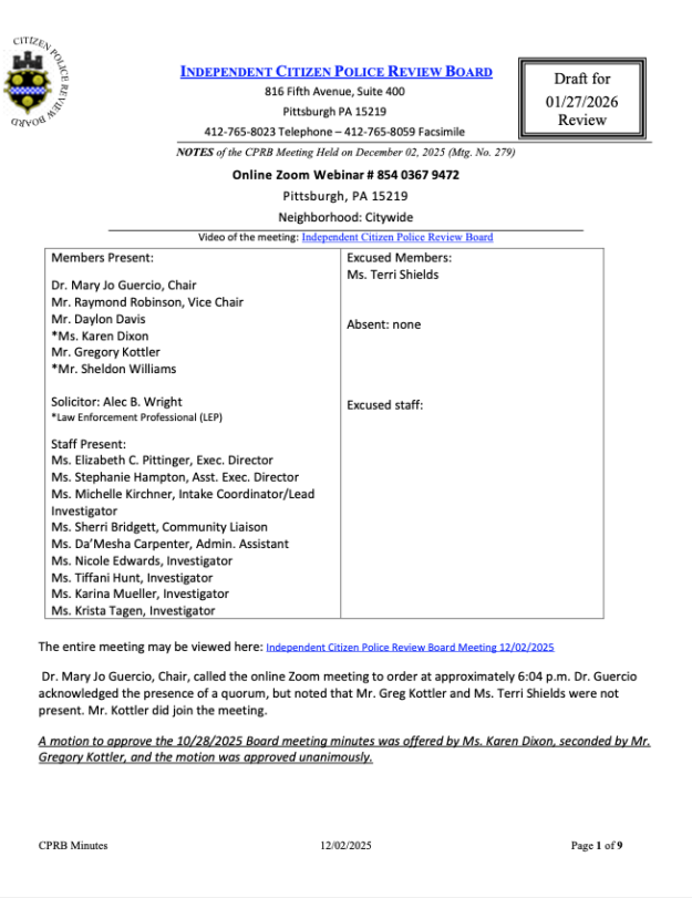 Home 9 CPRB Blog 9 Citizen Police Review Approved December Meeting Minutes and Agenda for January 27, 2026